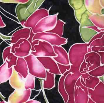 Moon Flowers by Pamela Mostek has provided for Clothworks in striking and vibrant colours depicting lotus flowers that unfold when the moon is full and close as the sun reaches midday.